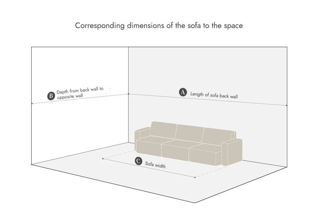 Subtract the space required for side tables, storage cabinets, and lighting fixtures from the “A Sofa Back Wall Length” to estimate the “C Sofa Width.”