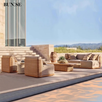 BUNISE Nordic Outdoor Wooden Sofa Set P37 - Designer Rattan Chairs with Coffee Table for Patios, Gardens, and Resorts