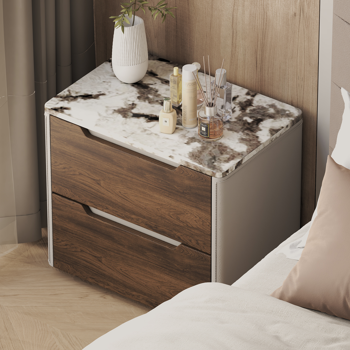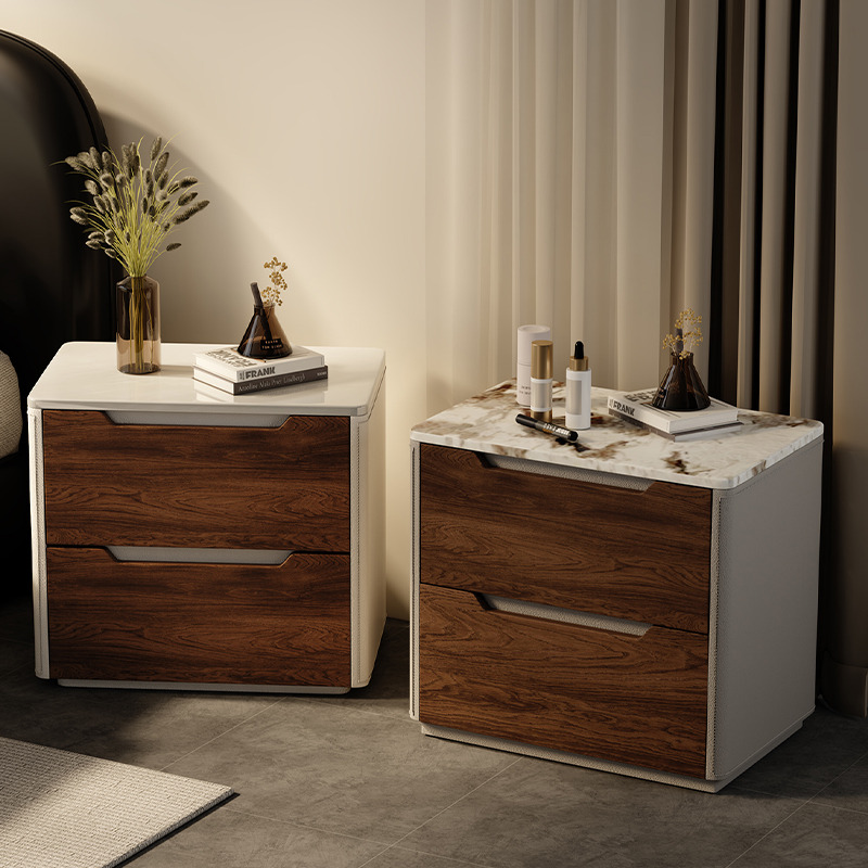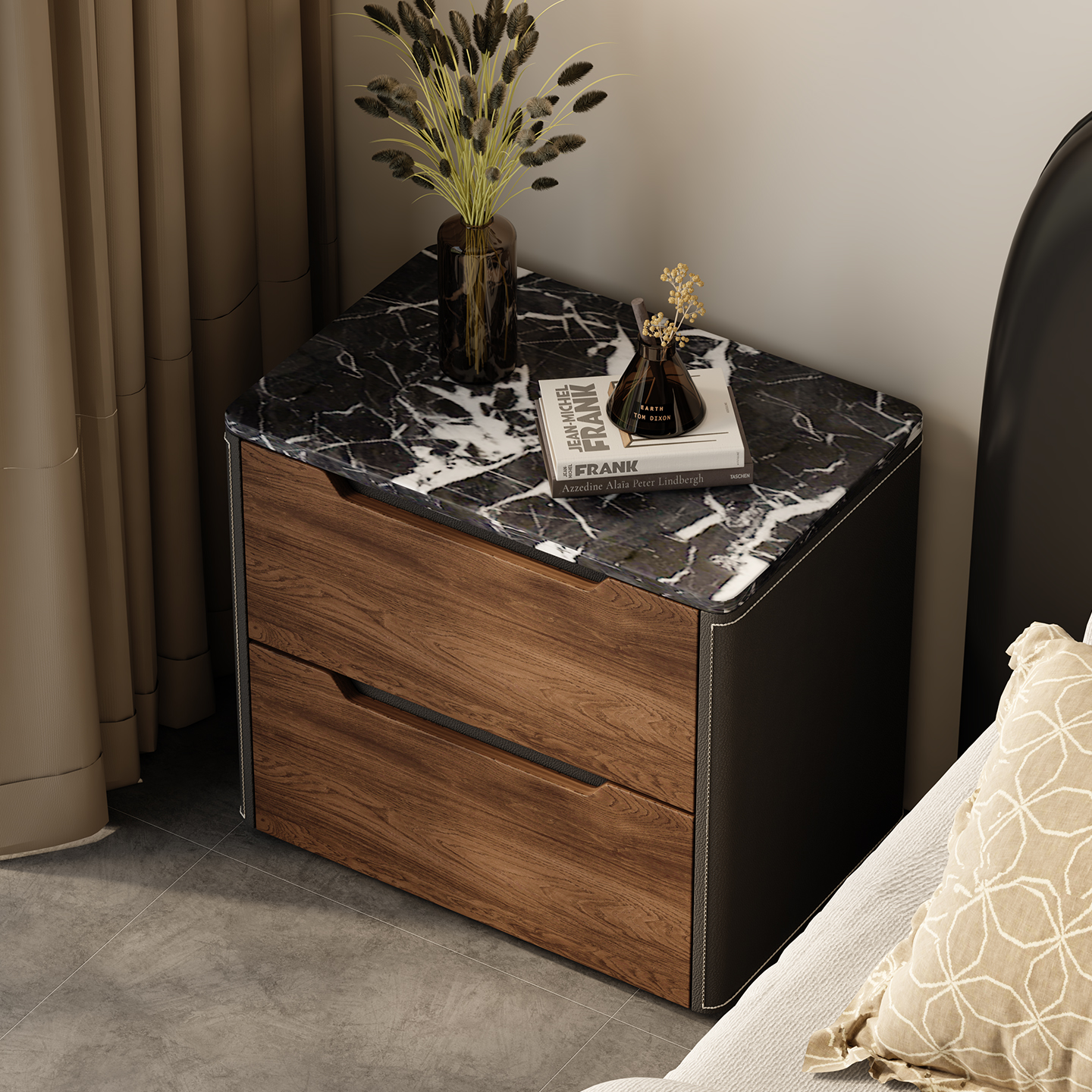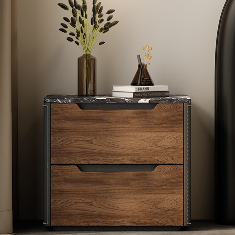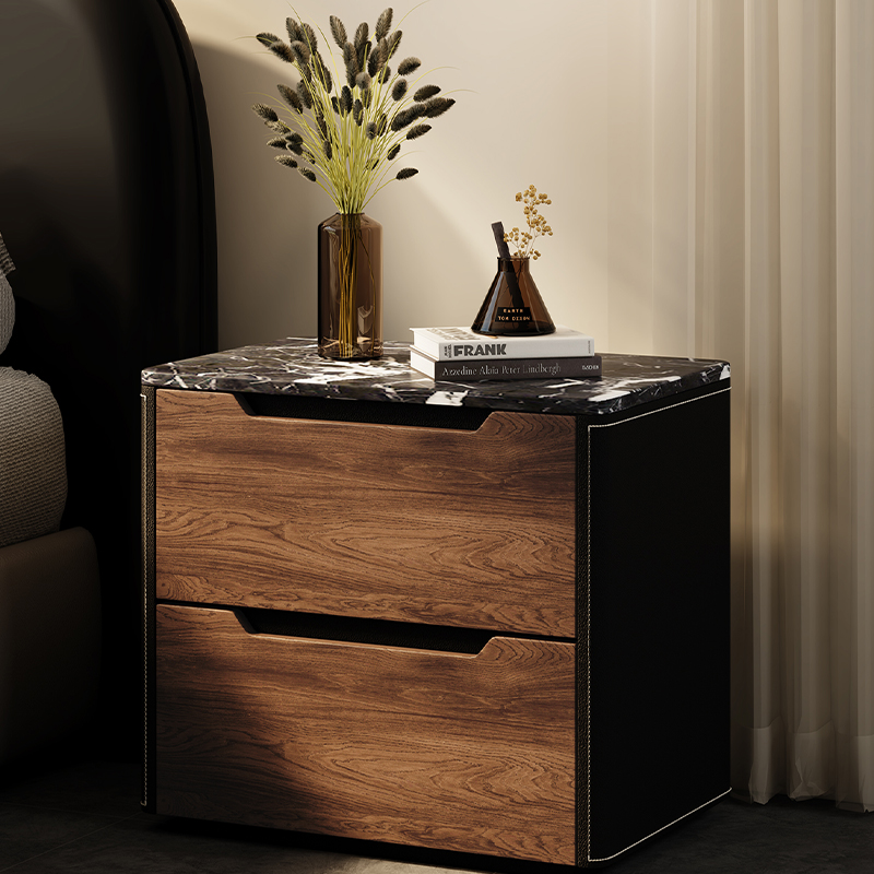 Black Solid Wood Bedside Table with Natural Marble Top Luxury Design for Master Bedroom Designer Style