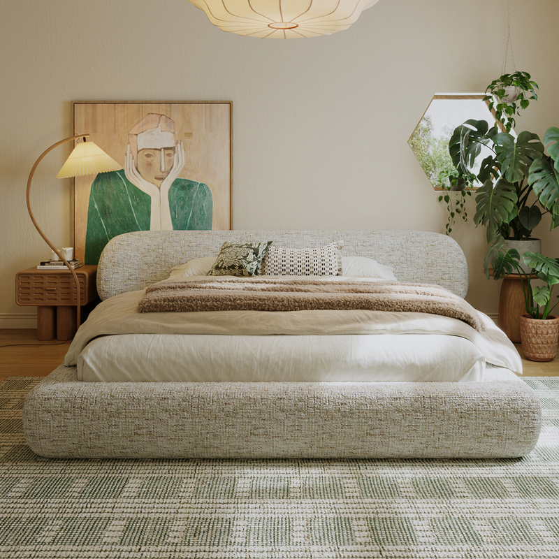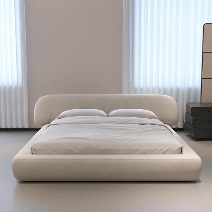 Bunise Cream-Style Fabric Bed, Bread-Shaped Design, Floor-Mounted, Minimalist Modern Style, with Storage Space. Soft Upholstered Real Wood Base, for the Master Bedroom