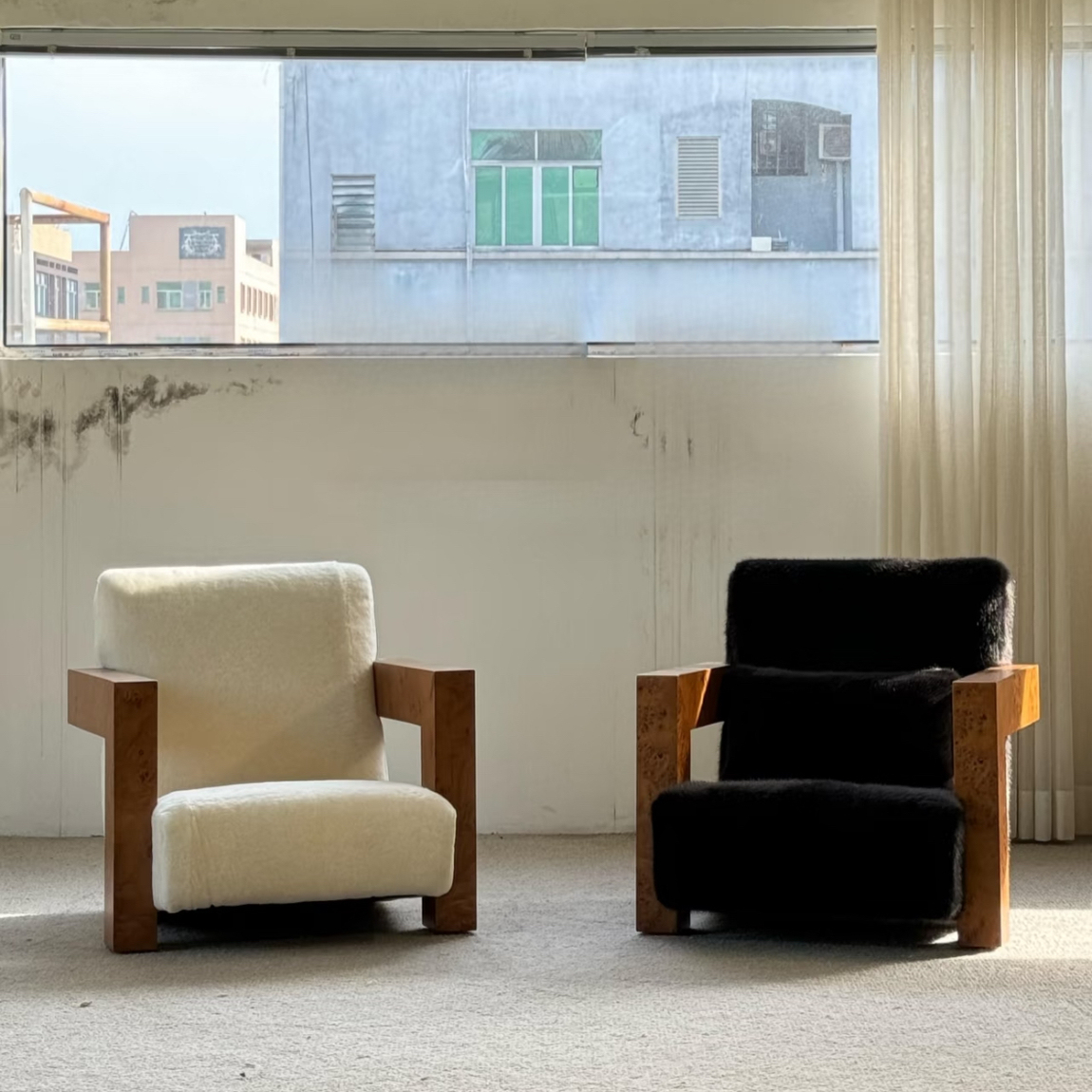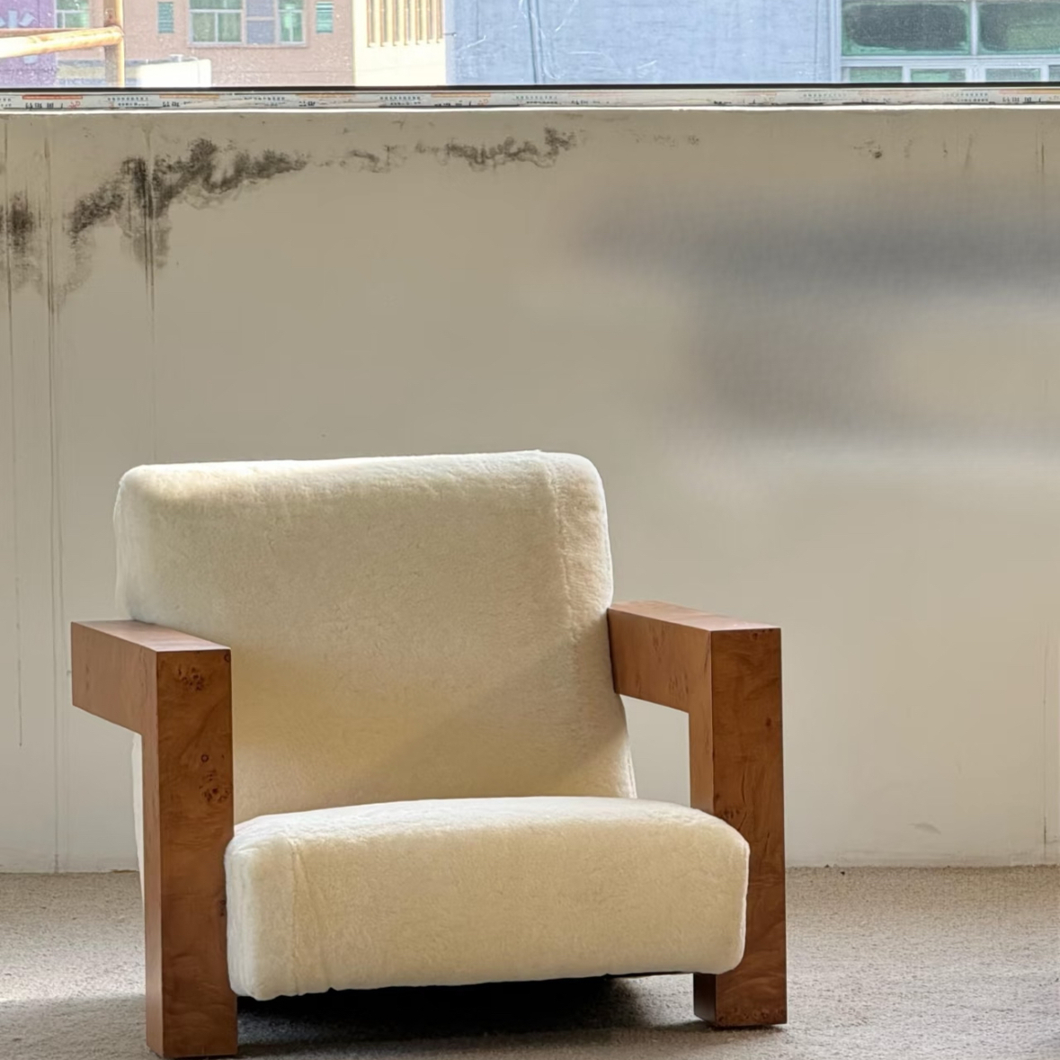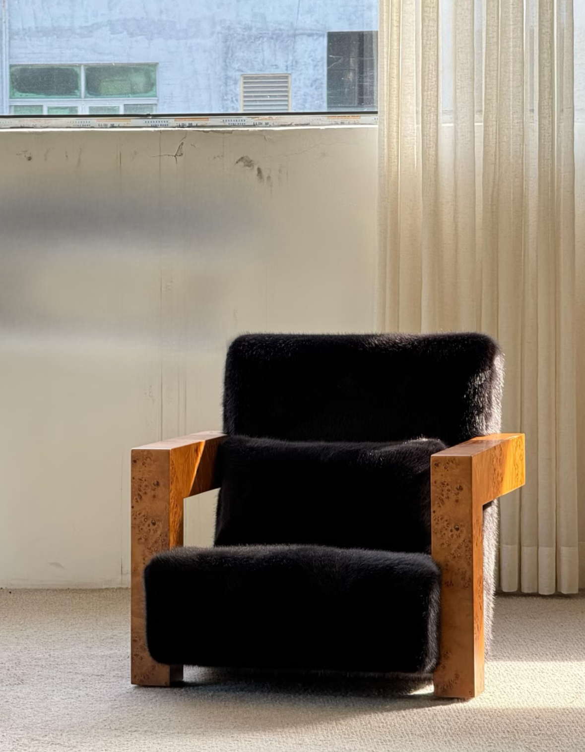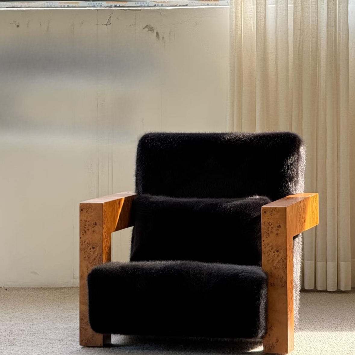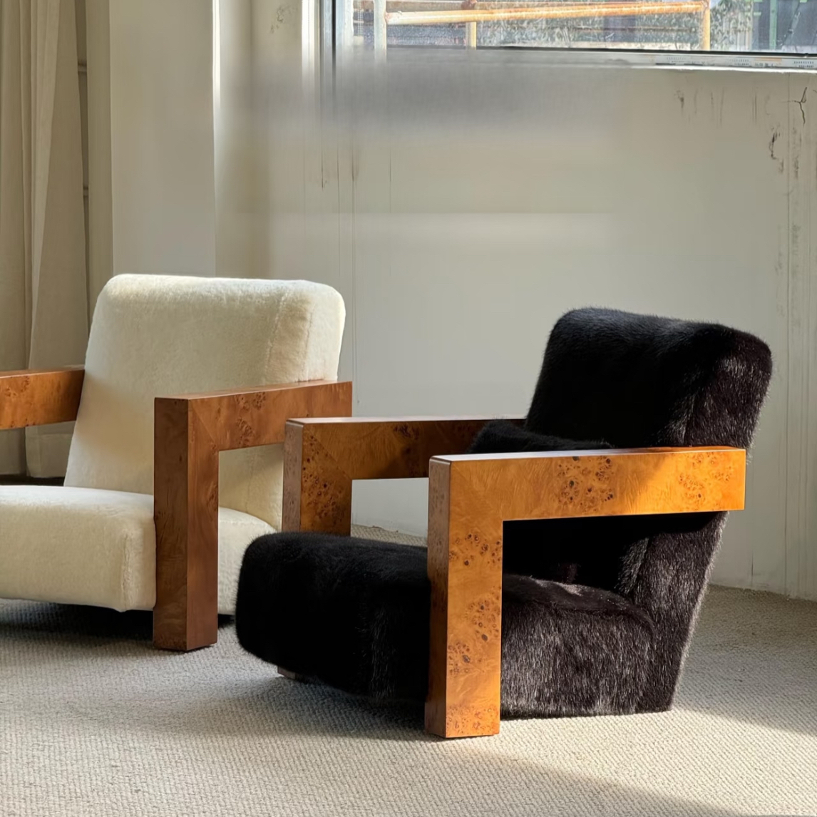 Single Sofa Chair Vintage Wabi Sabi Style Solid Wood Frame with Mohair Upholstery Designer Piece for Living Room and Balcony