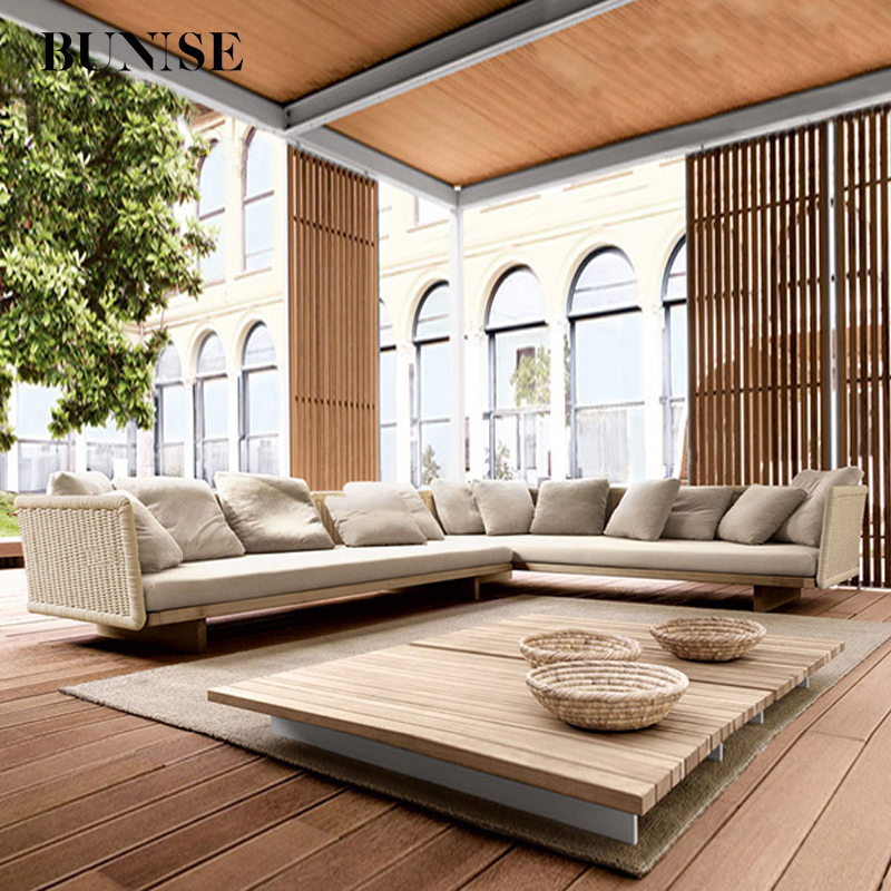 Outdoor Solid Wood and Rattan Sofa Set with Table and Chairs for Garden Balcony and Patio Designer Style Ideal for Homestay and Hotel