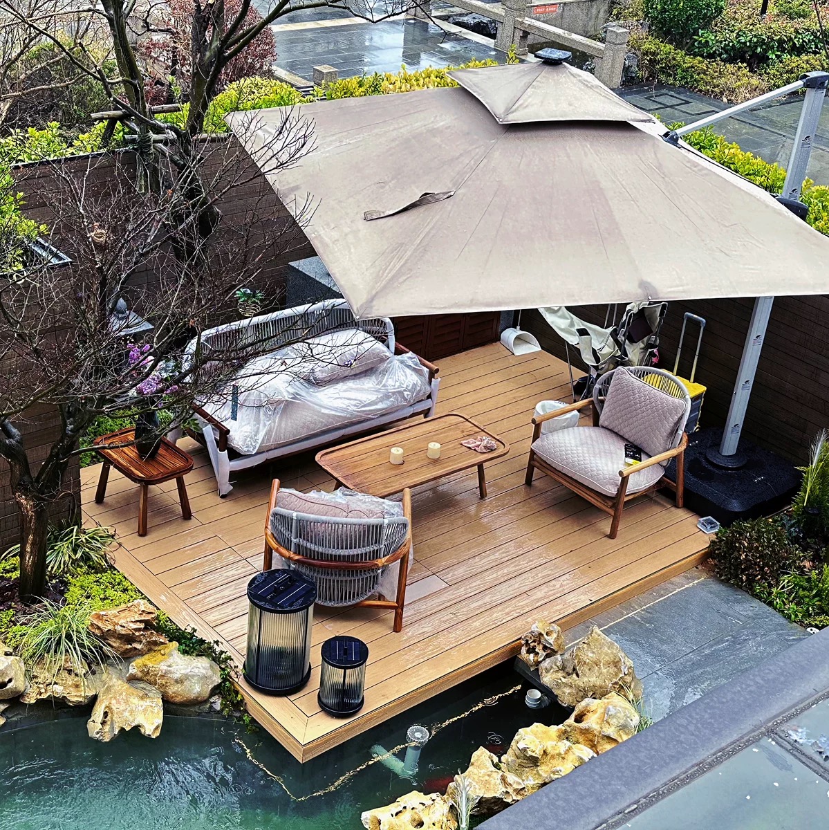 I’ve had this couch and the 2 chair set since March, it really is a gorgeous set of outdoor furniture! It doesn’t have a huge footprint but provides ample seating. The cushions are THICK and the frame is sturdy. Assembly was simple and quick.