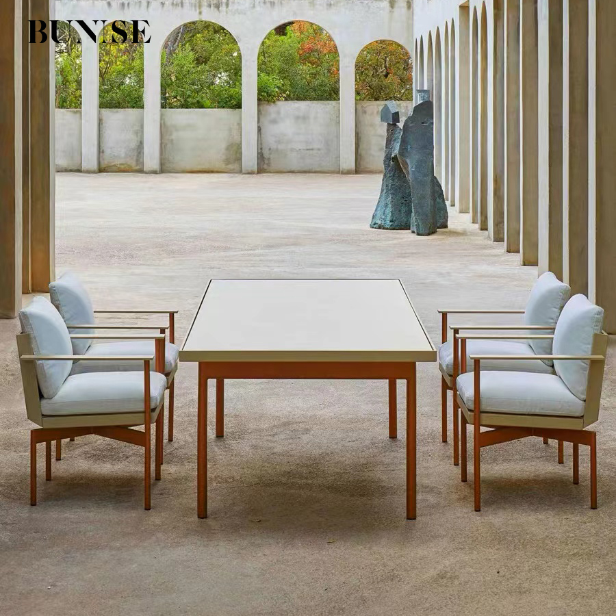 Designer Style Outdoor Stainless Steel Dining Table and Chairs Set with Marble for Villa Garden Terrace Living Room Waterproof Sunproof