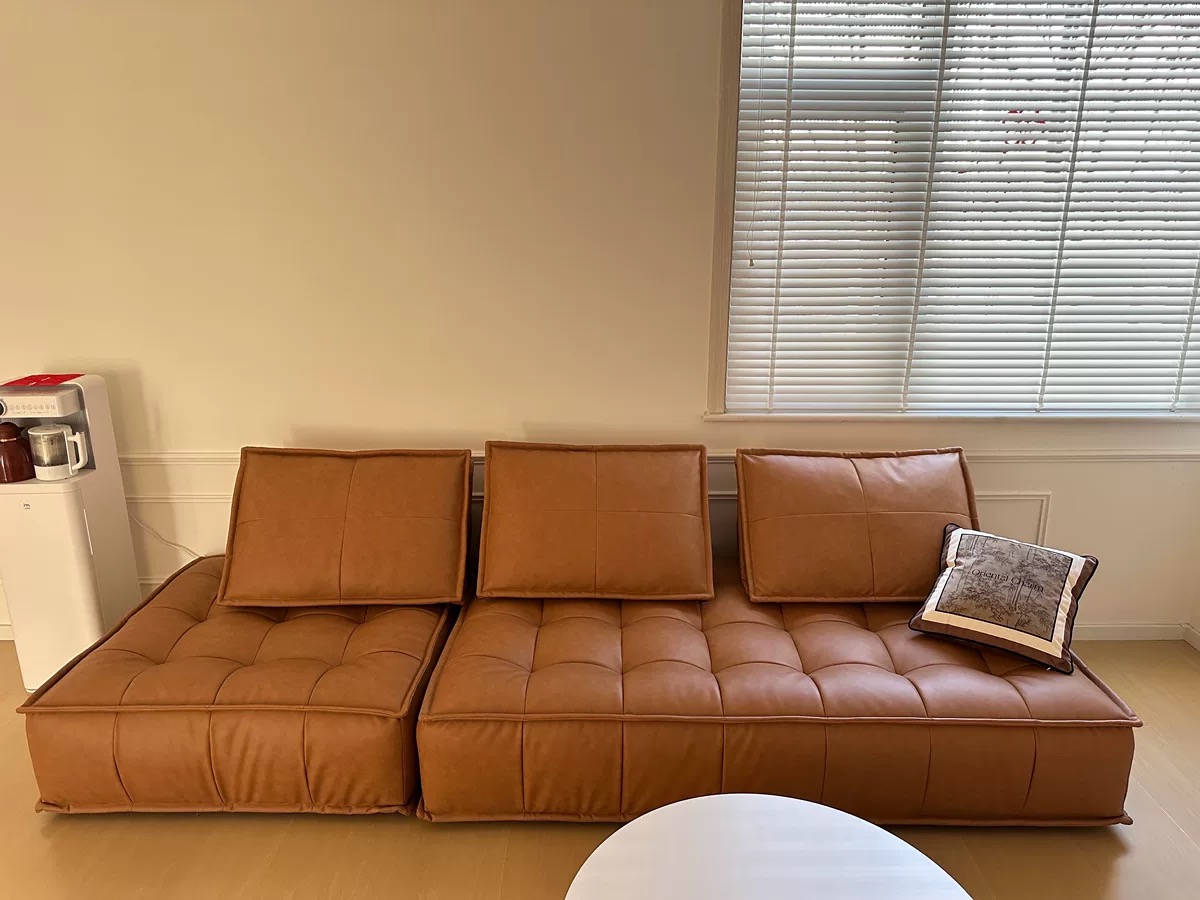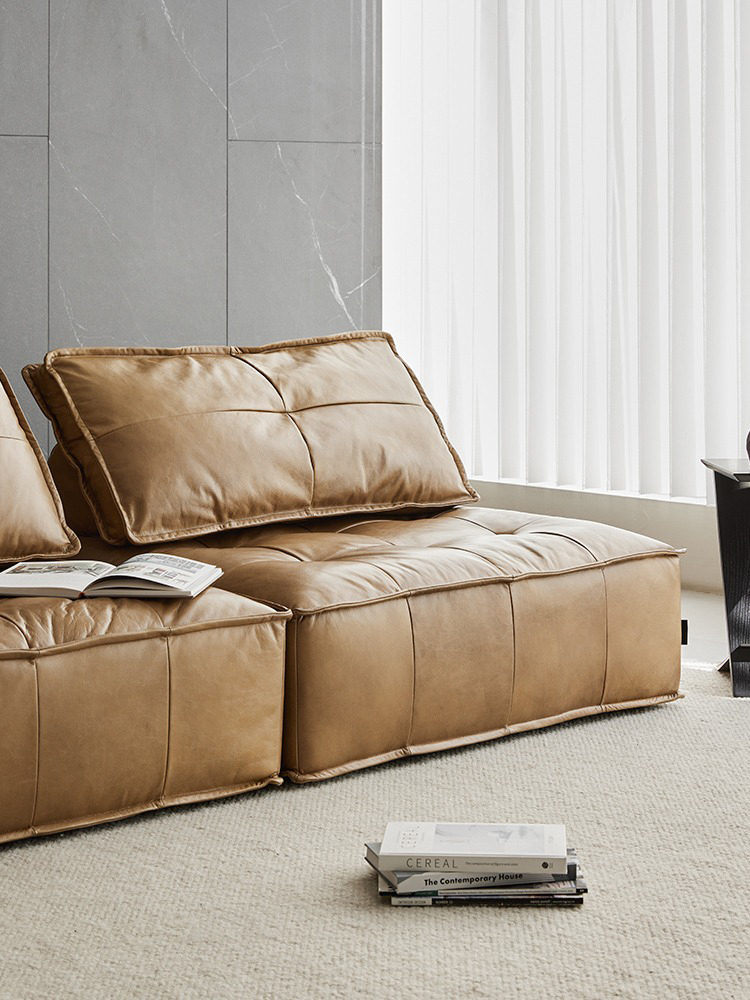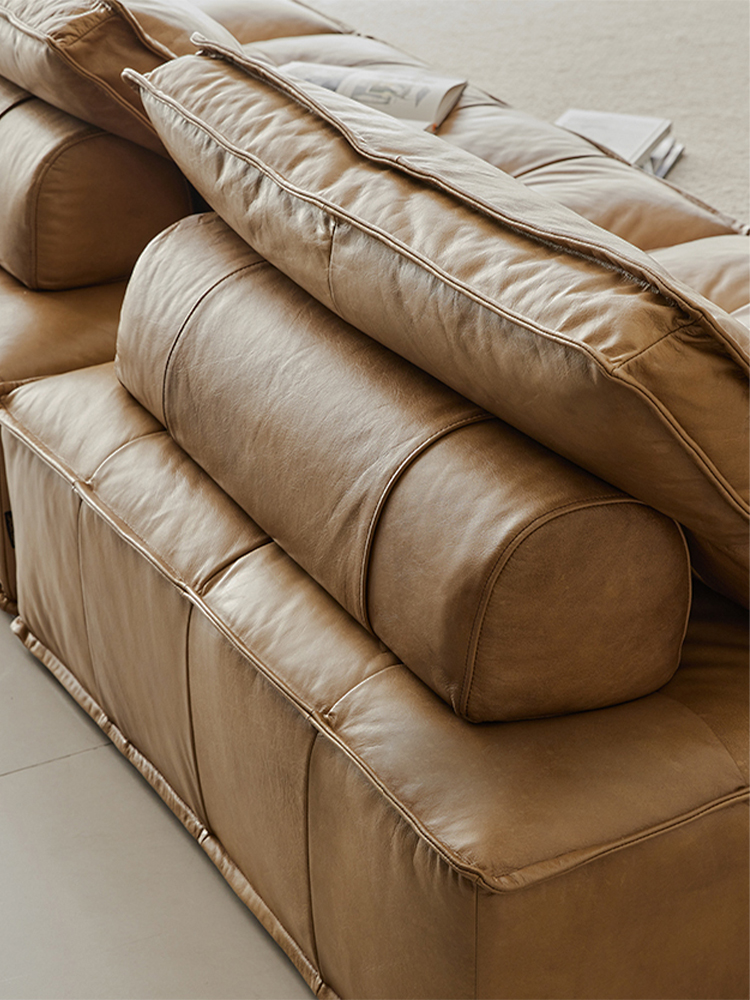 4 Seater Genuine Leather Sofa French Vintage Wabi Sabi Style Low Back Straight Modern Design Custom Made