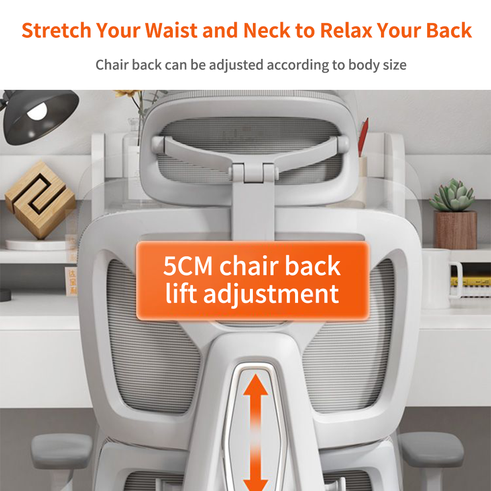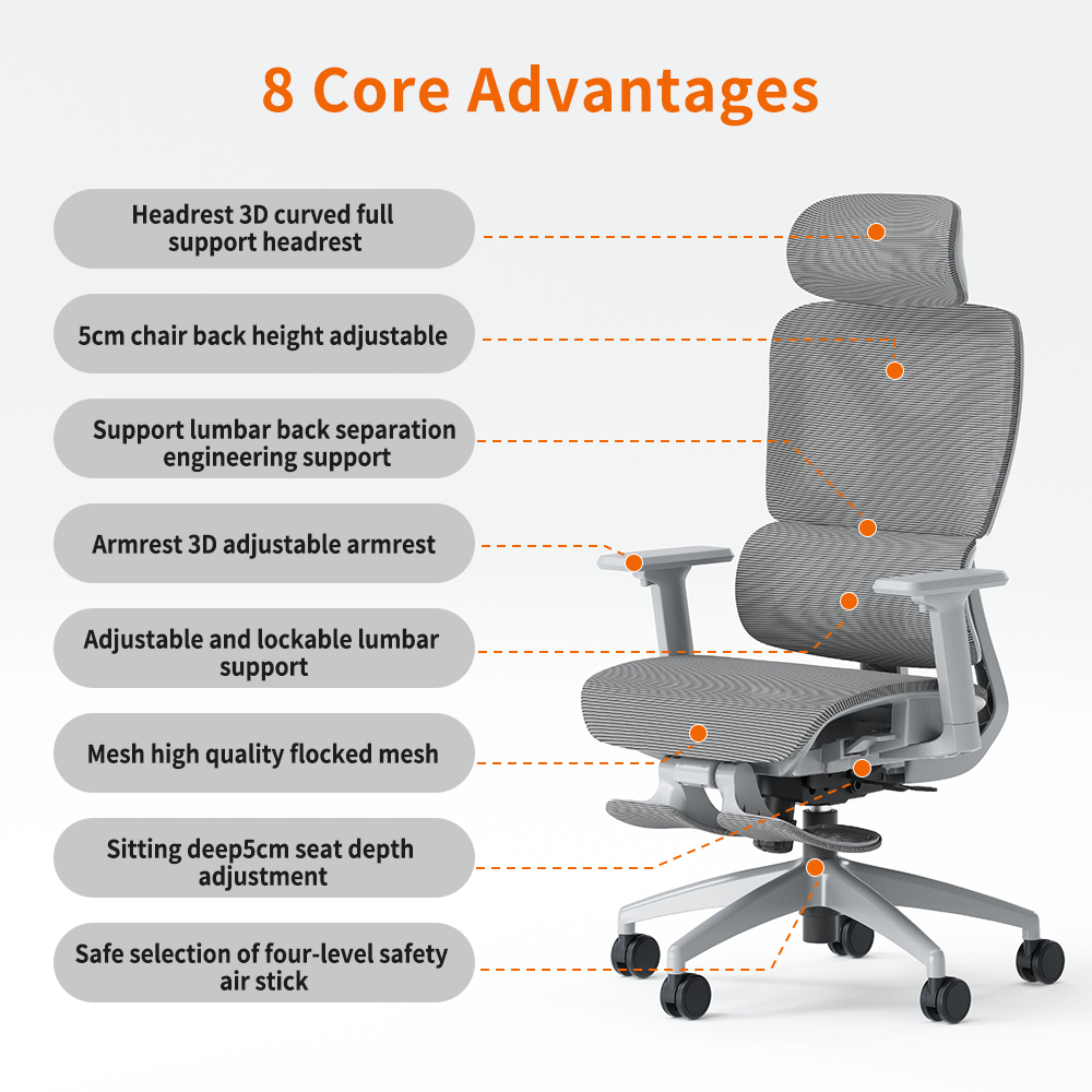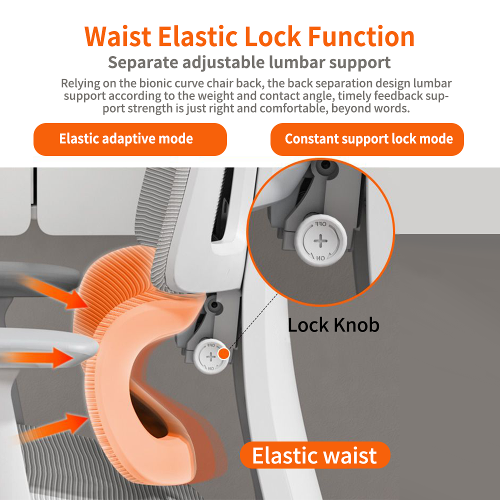 • Chair Backrest: The backrest is also made of PA material with a strong and durable mesh fabric cover, adjustable in height, and includes a lumbar support mesh.