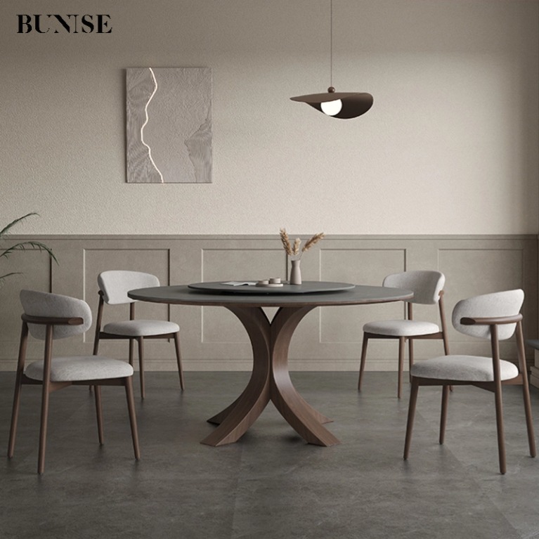 Round table with matte SLATE,Modern simple Italian dining table,High-end ash wood solid wood round table