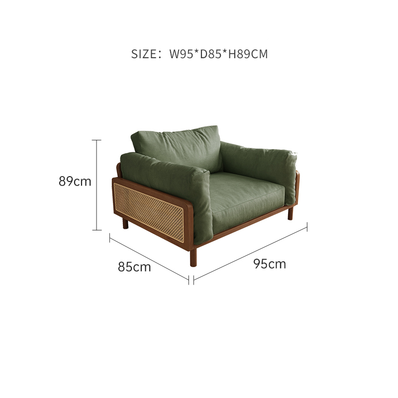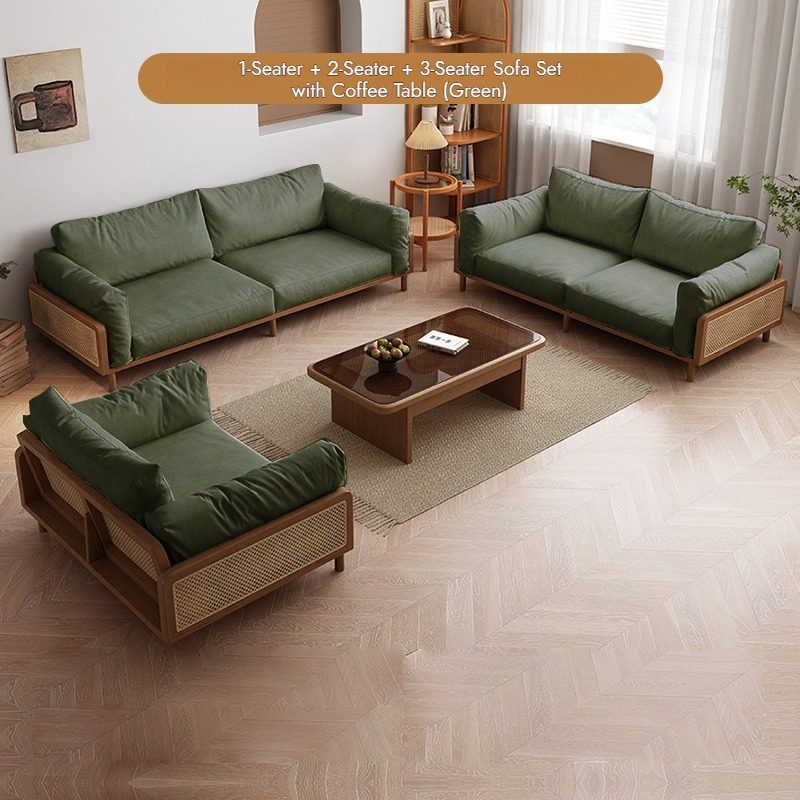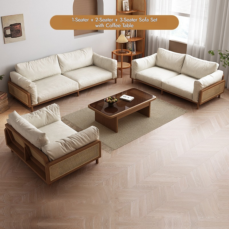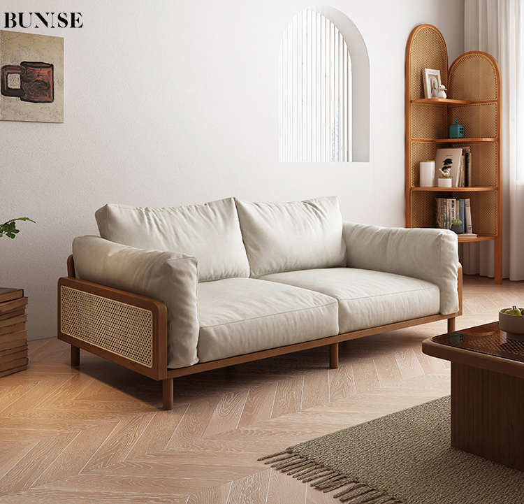 Nordic Solid Wood Rattan Sofa – 2/3 Seater Fabric Couch, Minimalist Ash Wood Frame, Natural Woven Design, Modern Bench for Small Living Room or Condo